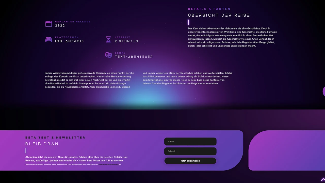 Spüre auf diesem One-Pager in Form, Farbe und Animation ein Hauch der Atmosphäre, die dich auf der Reise mit deinem fremden Begleiter erwartet - Der Rest passiert in deinem Kopf.