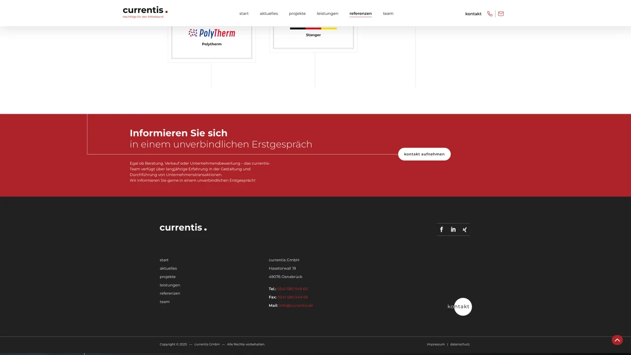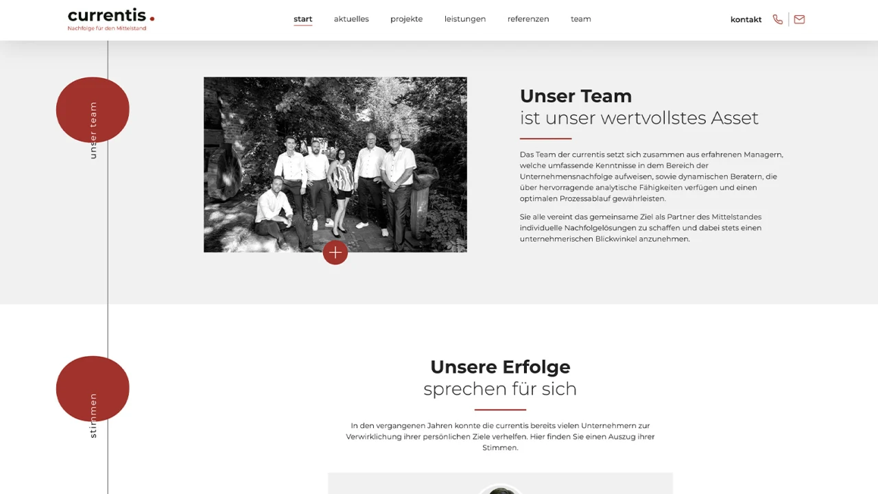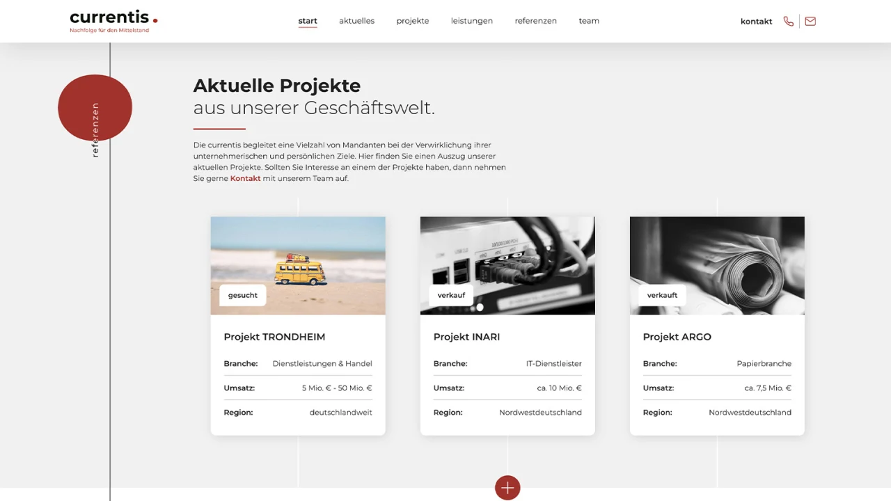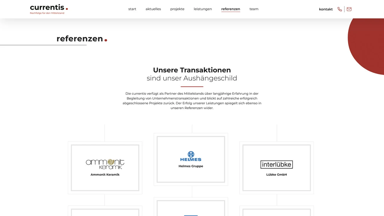 Die currentis GmbH ist ein präziser und hochprofessioneller Partner in der Begleitung von Unternehmensprozessen, Nachfolgen und Transaktionen. Jahrelange Erfahrung der Manager und Partner und viele erfolgreiche Transaktionen zeichnen die currentis GmbH als Partner und Begleiter in verschiedenen Unternehmensprozessen aus.